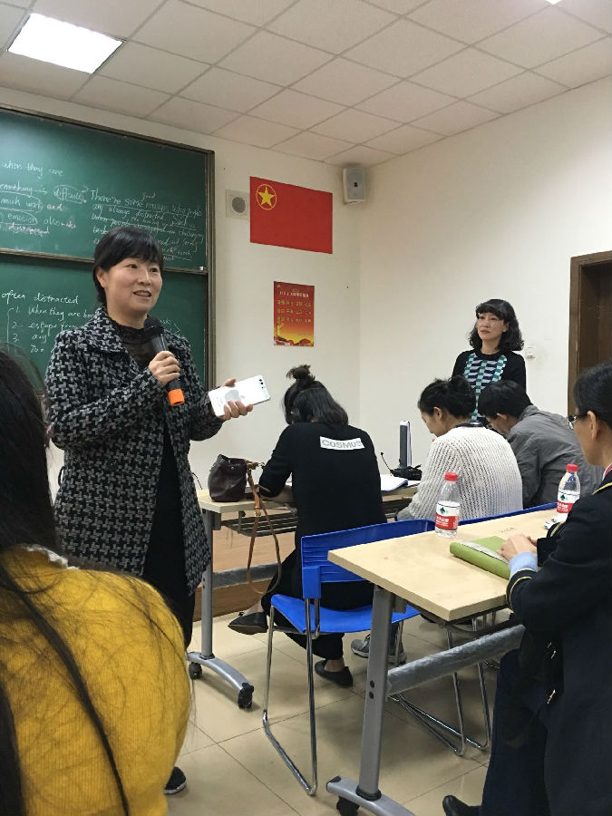 课后两位老师阐述了自己的备课思路。工作室助理张敏老师对这两堂课进行了综合点评。秀外慧中温文尔雅的张老师从更高的高度和更专业的角度肯定了这两堂课的优点,也提出了一些建议,如续写和概要写作时,我们更应从学生的角度思考,并且关注写作的速度、outline大纲、思维导图、topic sentences,让在座的老师们如沐春风,豁然开朗。